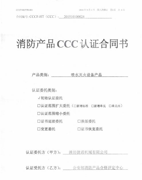 濰坊捷通(皆通)機械有限公司,本著"質量保障、誠信為本"的原則,響應國家監(jiān)督檢驗檢疫總局和國家認證認可監(jiān)督管理委員會統(tǒng)一發(fā)布的《強制性產品認證管理規(guī)定》,3c認證進行中....!目前是濰坊溝槽管件廠家為數(shù)不多的廠家。
